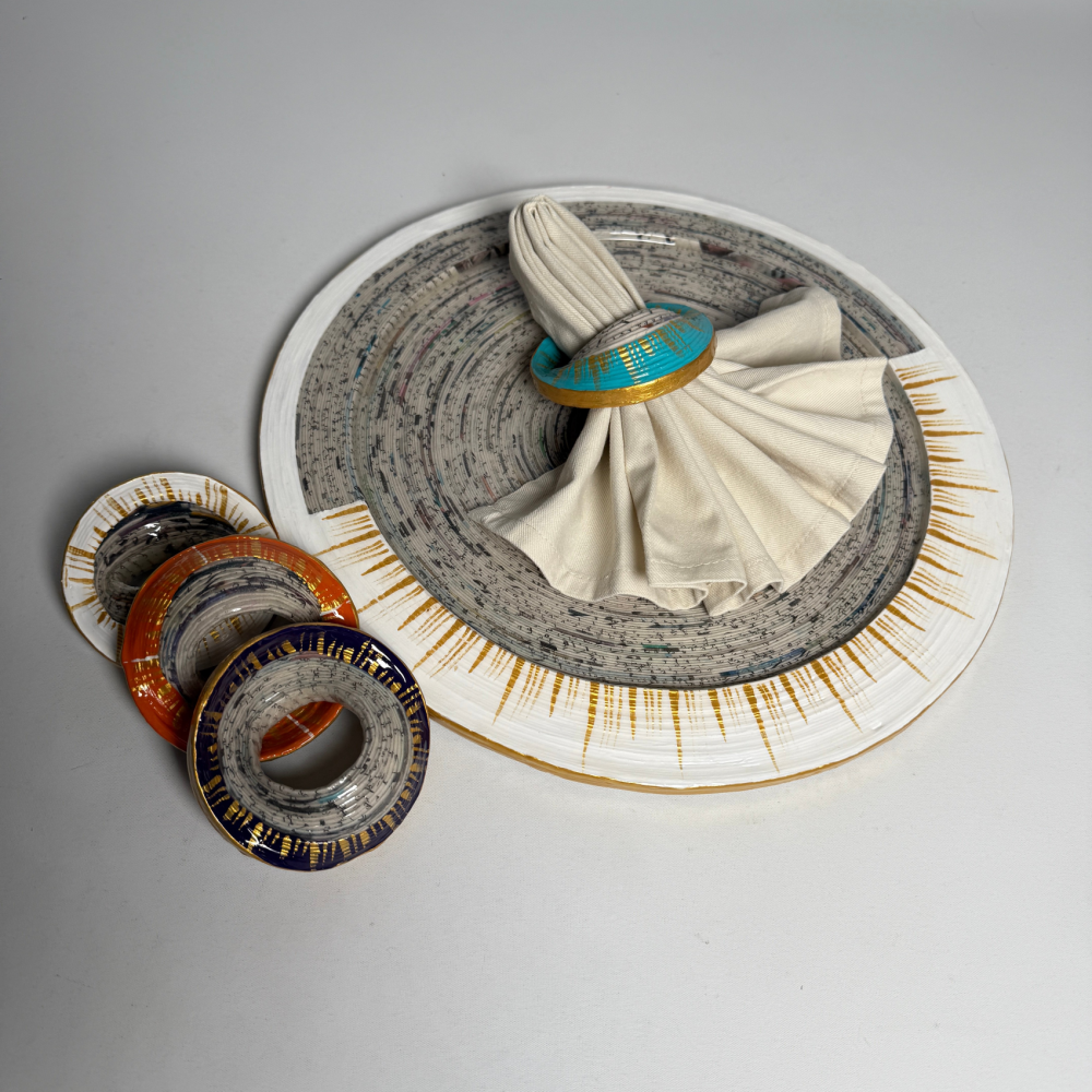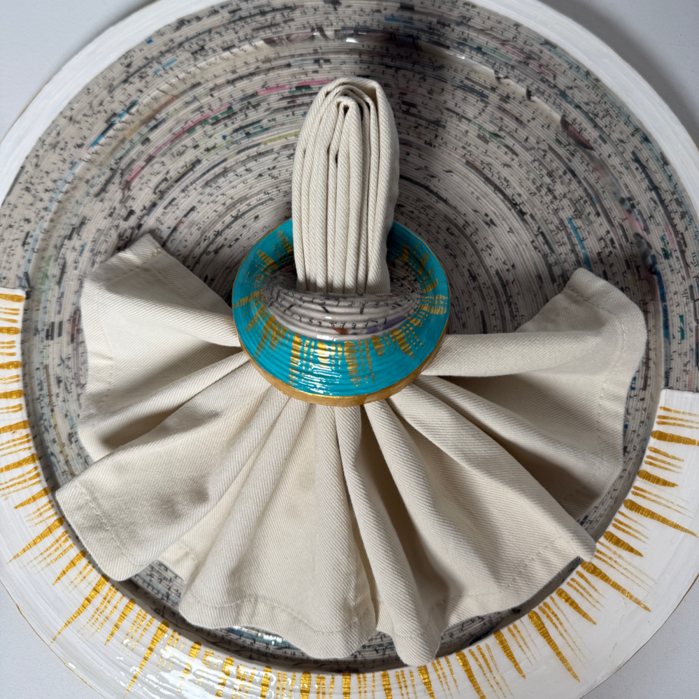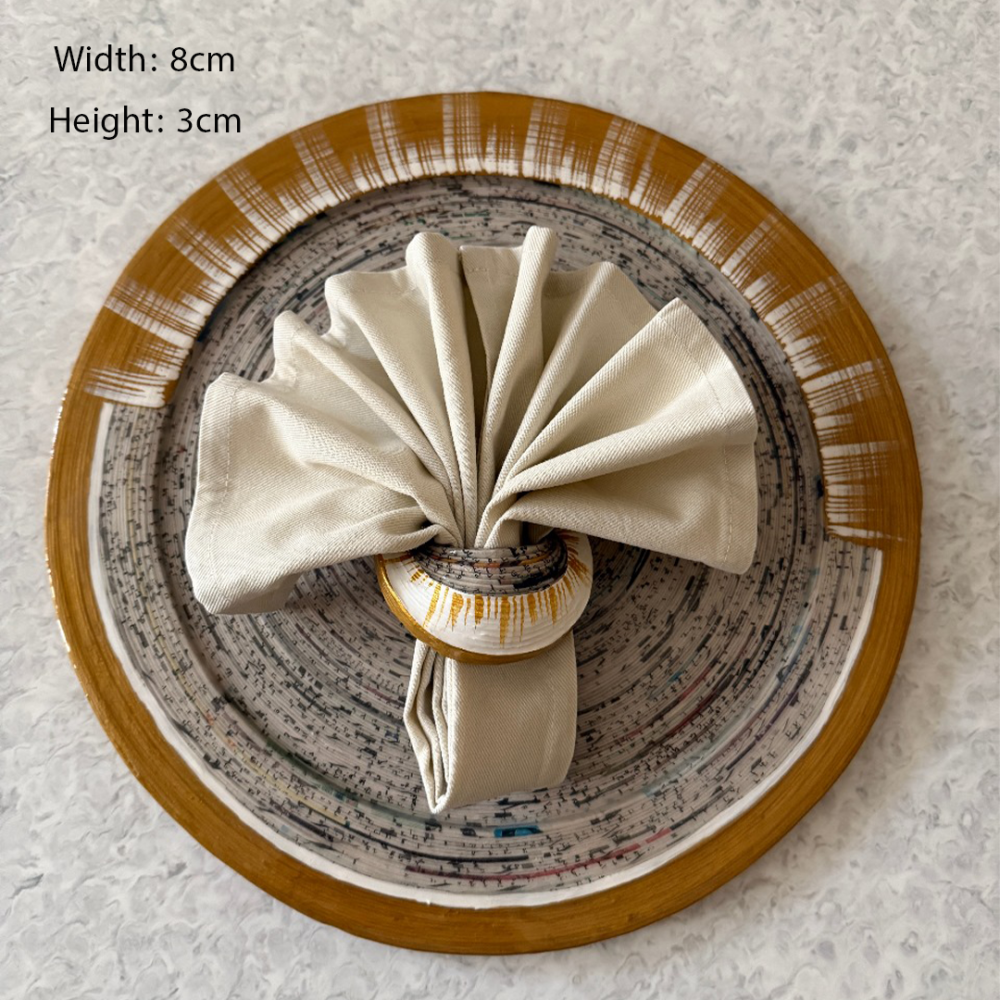 لفي مناديل ورقية بشكل أنيق ثم مرريها داخل الحلقة، بعدها توضع على الطبق أو بجانبه لإضافة لمسة جمالية مرتبة على التقديم.